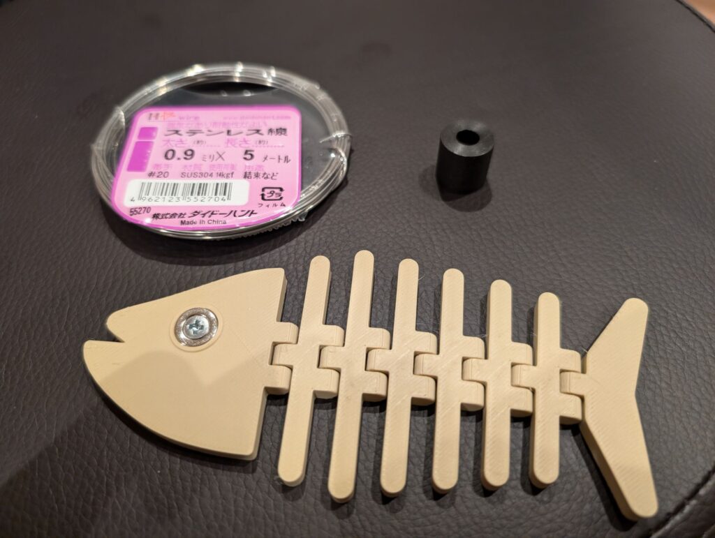 装着 1/14 22:12 2025年1月14日 DX戦記 カインズでSUS304の針金と M3皿ネジを買ってきた 20時頃にAmazonからネオジム磁石が届いたので 3Dプリントした魚「カツオ」に 磁石を装着した サイズもぴったりで 皿ネジの+がいい味を出して感動している あとは針金を3Dプリントした竿につけて 先端の針に職場に転がっていた謎鉄カラーを つければ最低限は完成♪